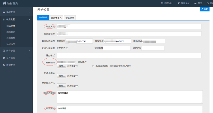 一.网站设置,这是站点必须的优化,主要的站点名称,服务电话,logo,关键词和描述,都是必不可少的,根据自己的网站来安排