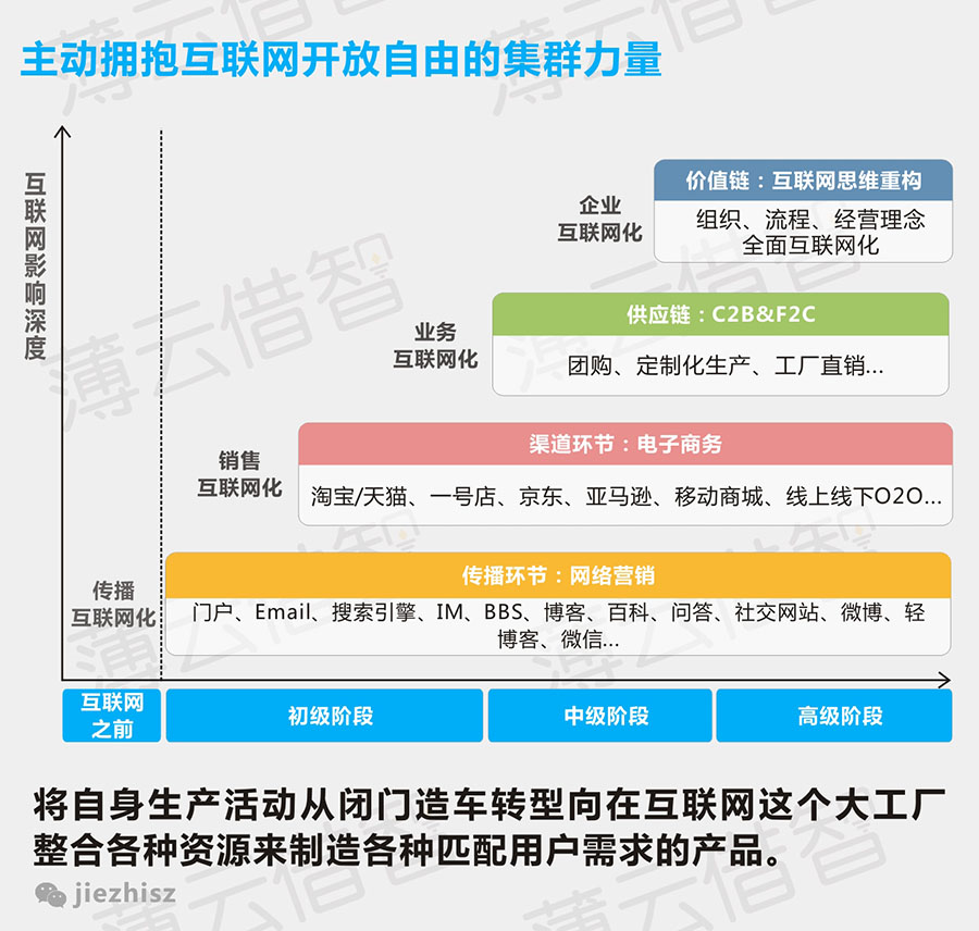 传统企业向“互联网+”转型带来的就不再仅仅是一种技术手段,而是触发一系列地震:企业组织架构变革、商业模式改变、工作流程的重组、行业价值链颠覆、基于大数据的分析决策要求等等,以及整个社会管理思想的变革。